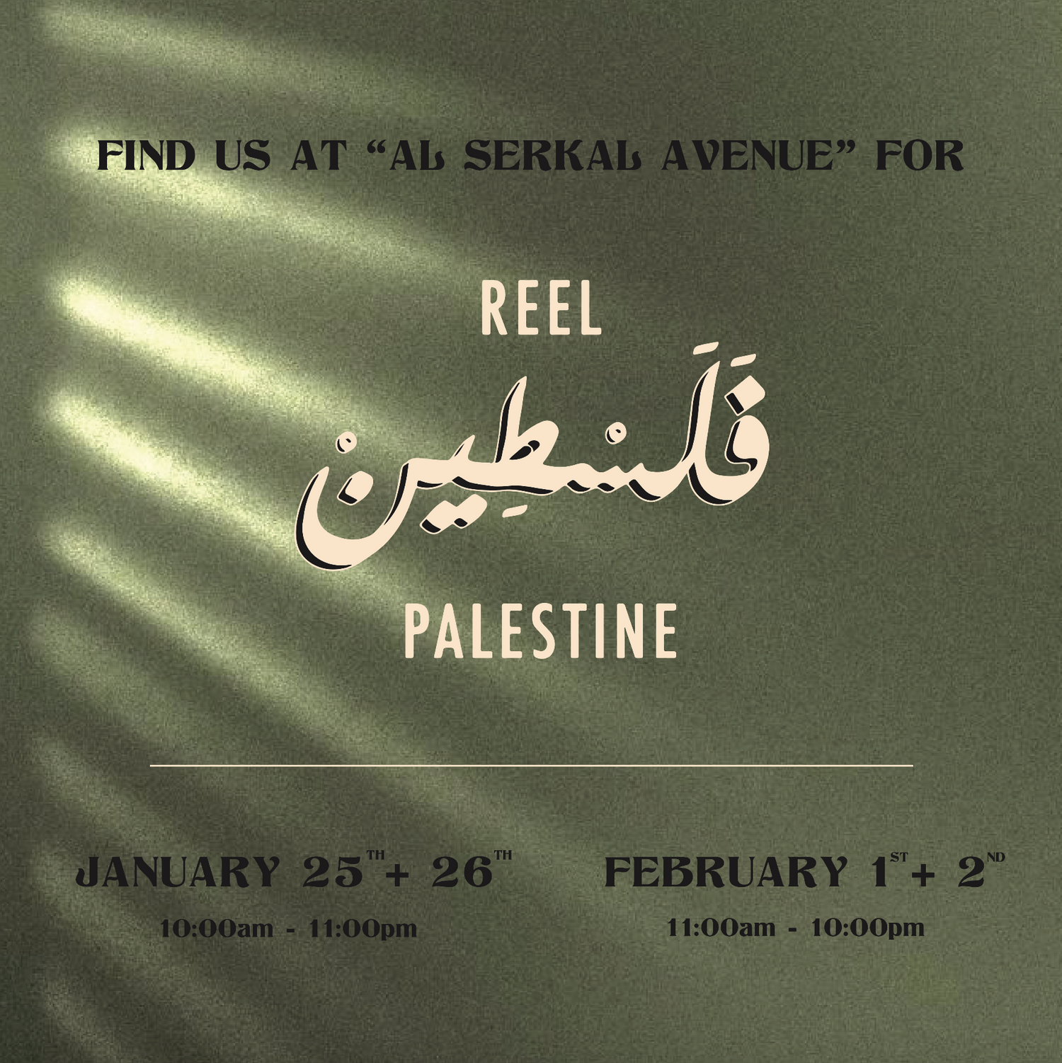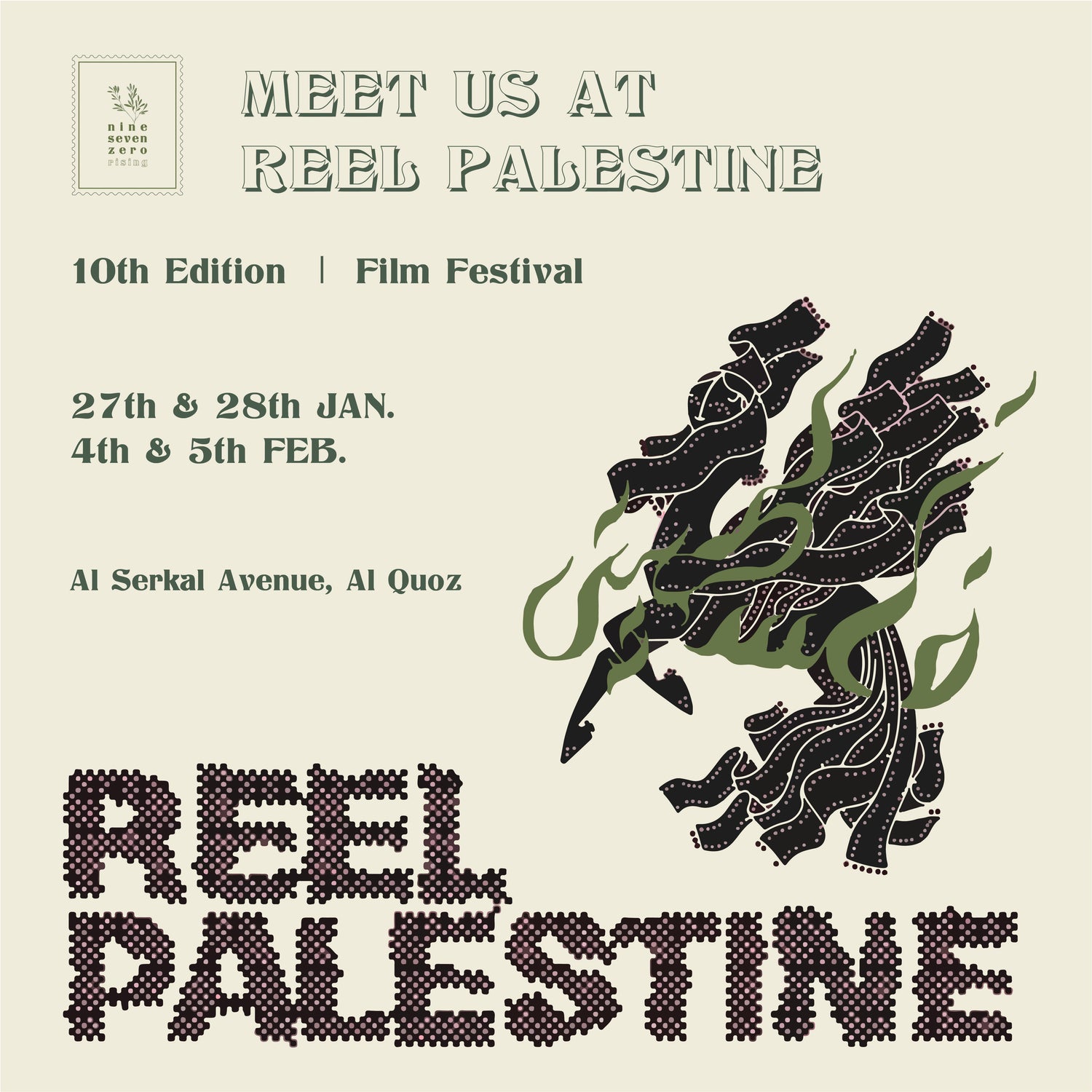Join us at Al Serkal Avenue for this year's Reel Palestine, on 27th + 28th of January and 4th + 5th of February. Reel Palestine is an annual film festival in the UAE bringing Palestinian stories in the artistic form of independent and alternative cinema.