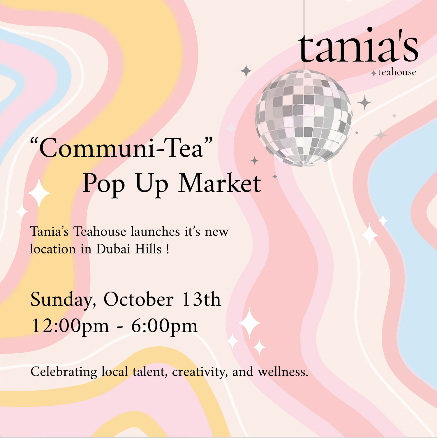 Tania's Teahouse is launching their new store and we're here to be a part of it ! Meet us at Dubai Hills on the 13th of October between 12:00pm until 6:00pm to celebrate local talent, creativity and wellness.
