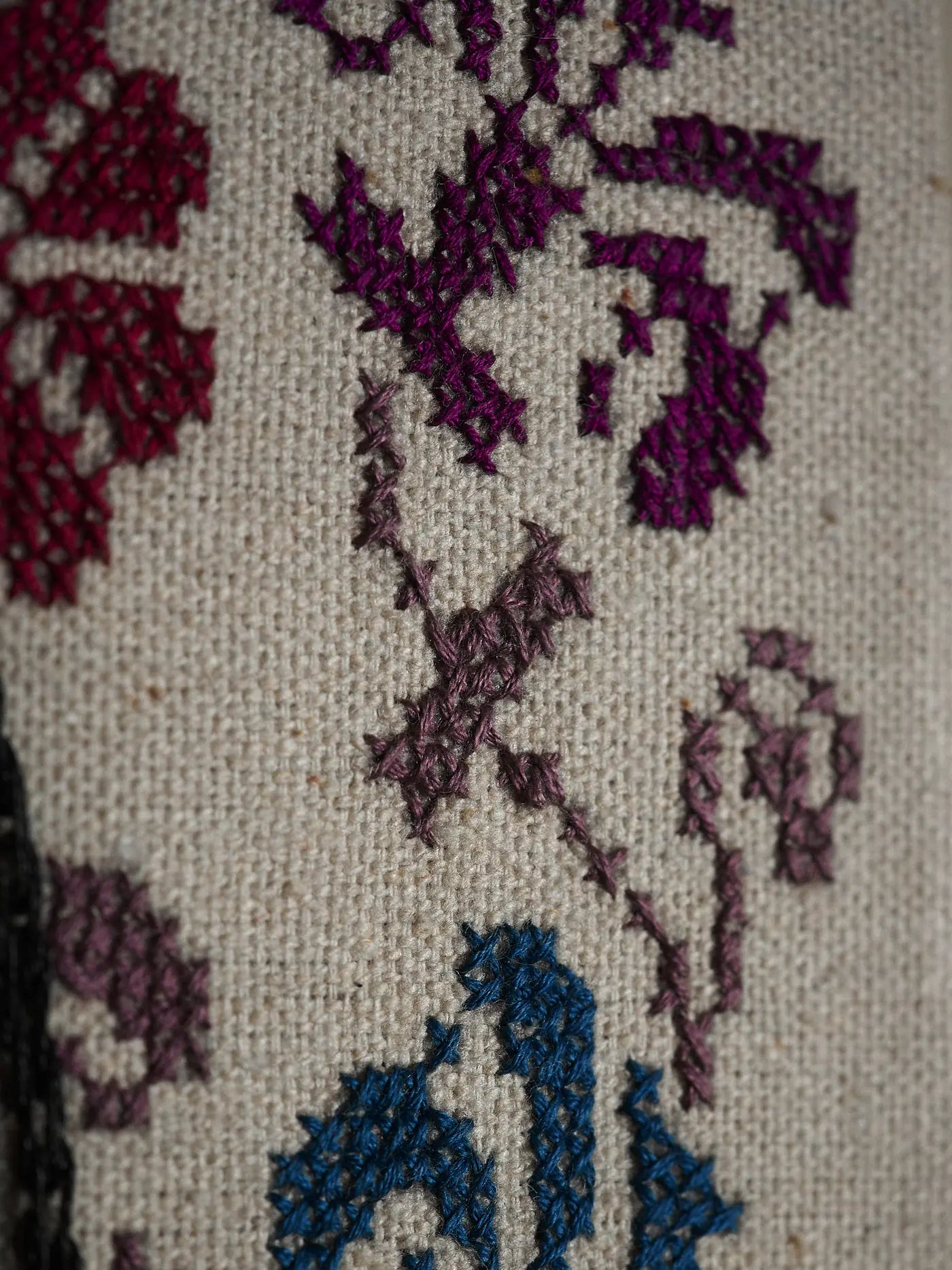 Hand-stitched Palestinian Tatreez (embroidery) on stretched canvas. Our artworks are made to order, please give a time of 1-3 months for the portrait to be completed as they are hand stitched by us.