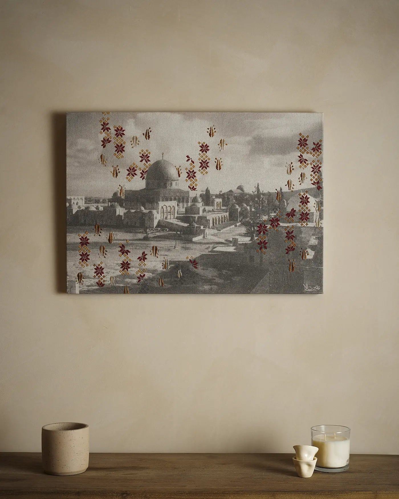 Hand-stitched Palestinian Tatreez (embroidery) on stretched canvas.