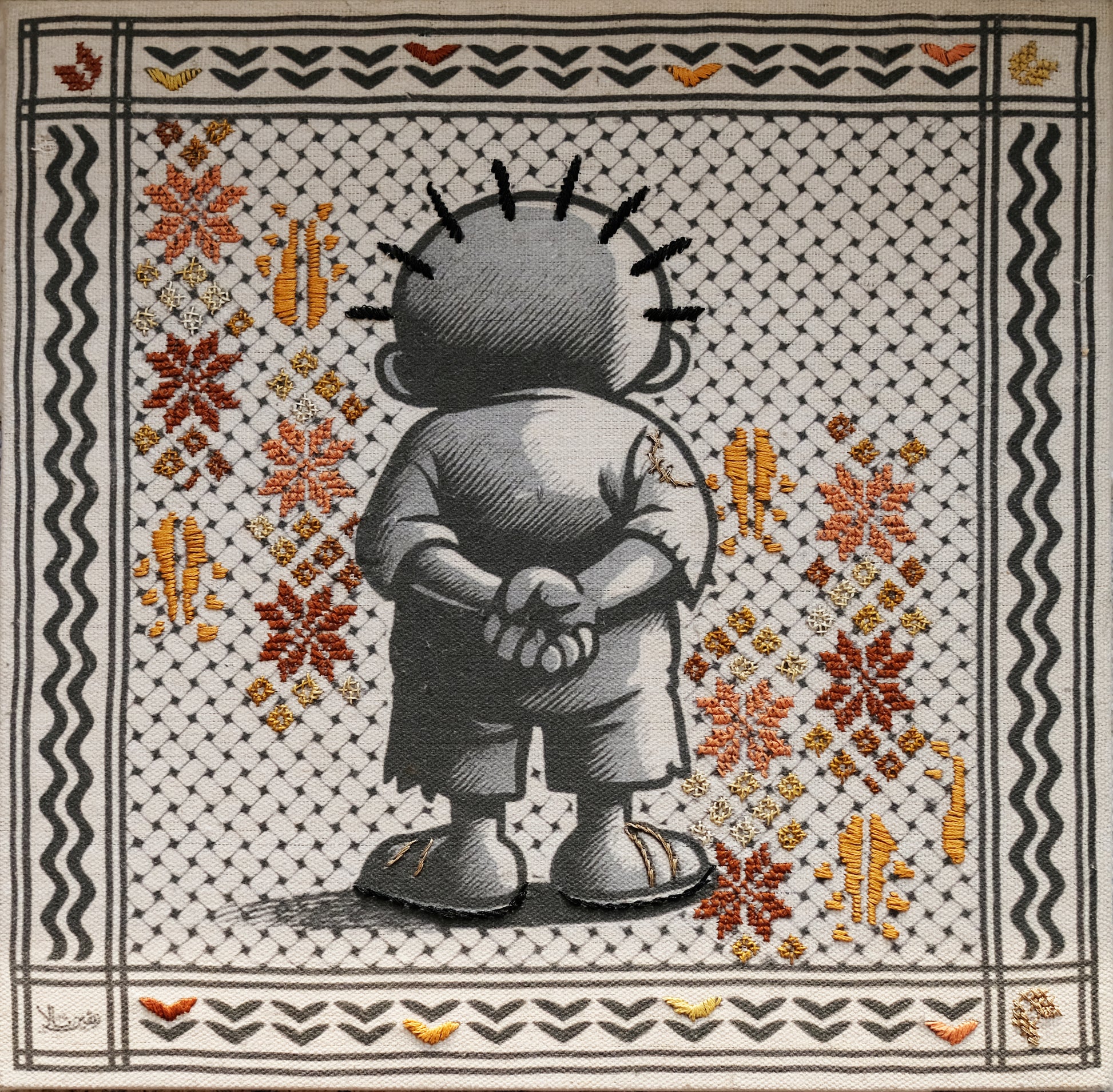 Hand-stitched Palestinian Tatreez (embroidery) on stretched canvas. Our artworks are made to order, please give a time of 1-3 months for the portrait to be completed as they are hand stitched by us.