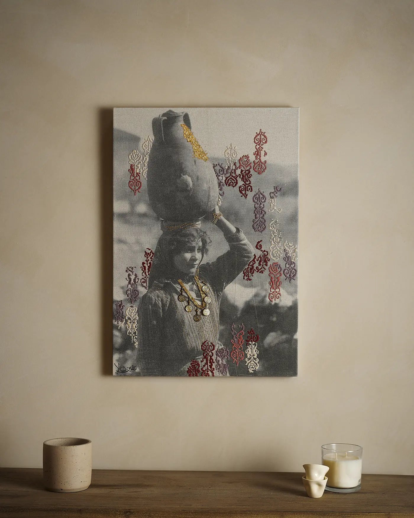 Hand-stitched Palestinian Tatreez (embroidery) on stretched canvas. Our artworks are made to order, please give a time of 1-3 months for the portrait to be completed as they are hand stitched by us.